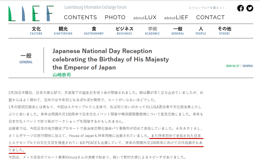 本記事は、在ルクセンブルク日本国大使館主催の天皇誕生日祝賀レセプションの様子を伝える中で、出展者の一組として8PEACEにインタビューを実施いただき、2027年日本とルクセンブルクの外交関係樹立100周年に向けて進めている「鳩笛プロジェクト」の作品展示と活動について掲載いただきました。