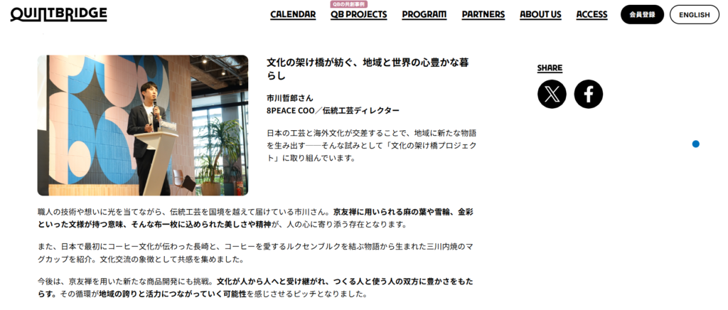 2025年12月23日、「地域の心豊かな暮らし」をテーマに開催された共創イベントにおいて、8PEACE COO/伝統工芸ディレクター 市川哲郎が登壇し、その様子がQUINTBRIDGEの公式Webサイトに掲載されました。